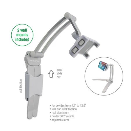 In how many situations would you like to have both your hands-free, but still have full access to your smartphone or tablet? This mount puts your devices right in your field of vision – whether you’re video chatting, cooking, working, gaming, putting on makeup, or just reading or binging on series. We even provide you with a second wall mount, so you are even more flexible!