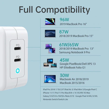Have an iPhone, Android or Pixel device? You can fast charge them at once using the 2 USB-C Charging ports! A compatible USB-C to C 1.8m cable is also included, so you do not have to riffle through old cables and you can start charging any device straight away.