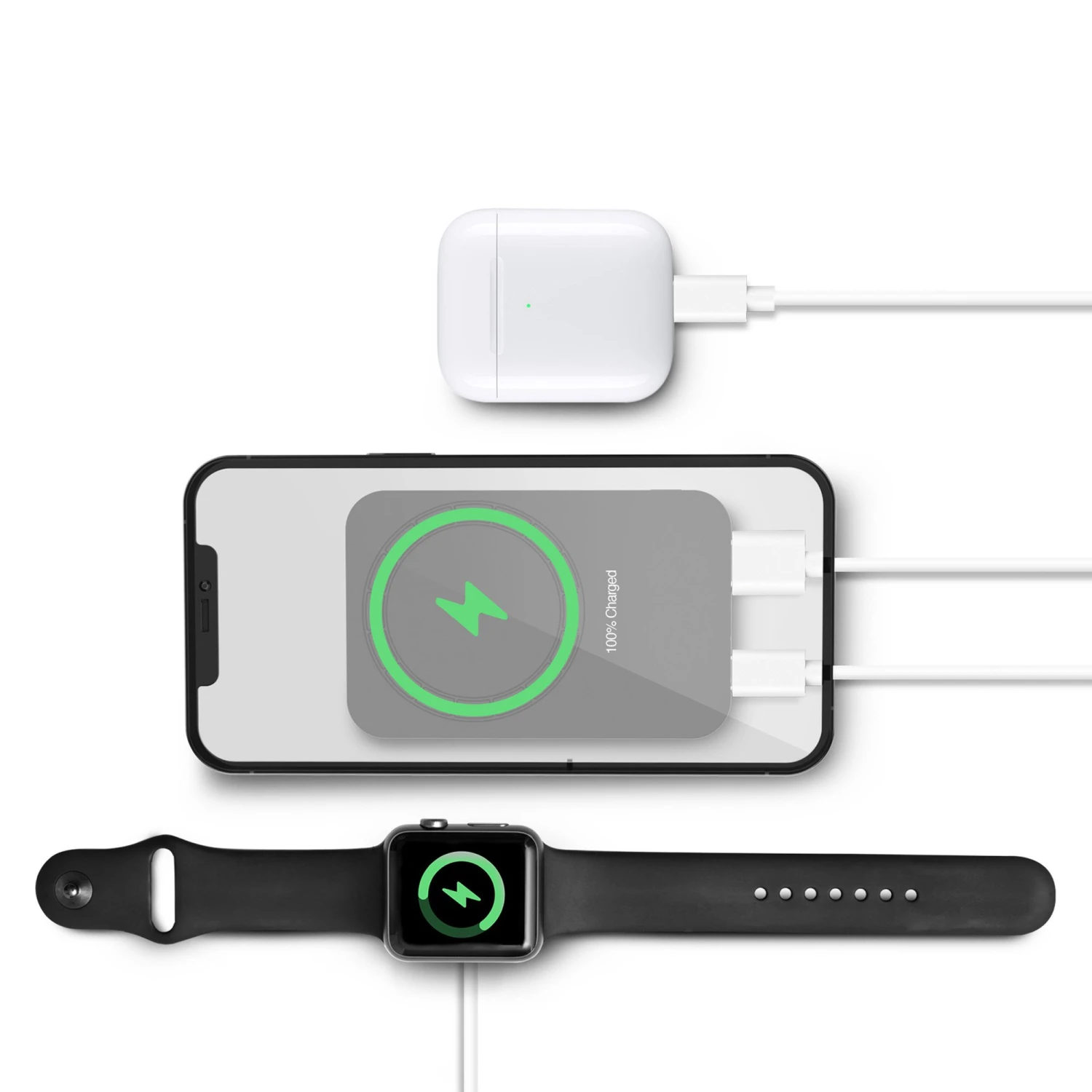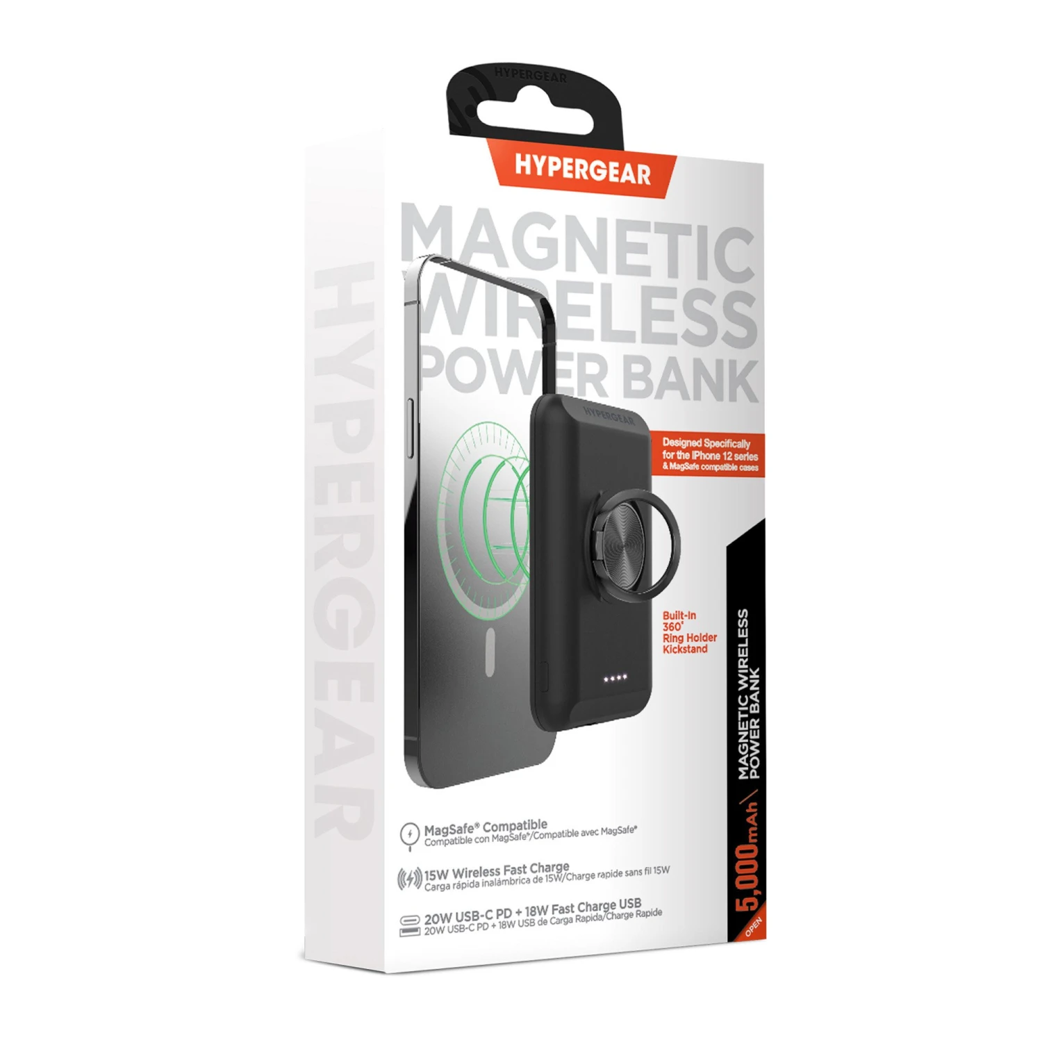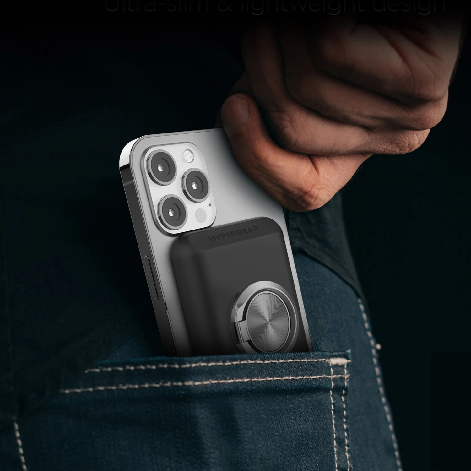 Don’t let a low battery interrupt your flow while on the go! The Hypergear 5000mAh Power Bank has precise magnetic alignment that stays locked in place, so there is no need to readjust as you charge. Experience 3X the power of standard wireless and wired chargers in 15W of immediate wireless fast charging. Plug in additional devices to the powerful dual outputs—20W USB-C Power Delivery and 18W Fast Charge USB. The ultra-slim and lightweight design makes for the perfect fit that won’t block your camera or add extra bulk to your phone. The built-in 360° ring holder kickstand provides an extra grip or can prop up your phone for streaming, scrolling, or making content on the go. Snap and go wireless charging!