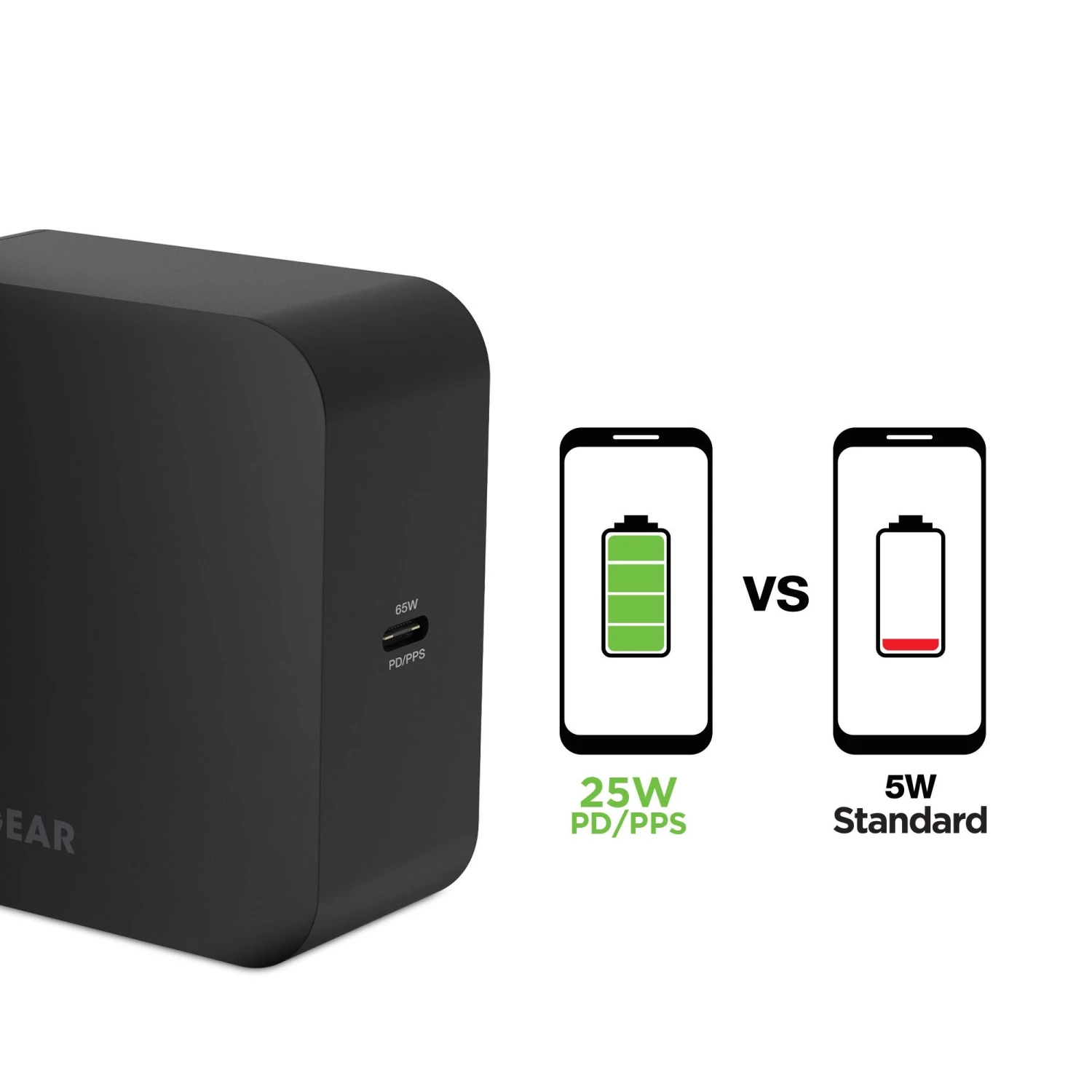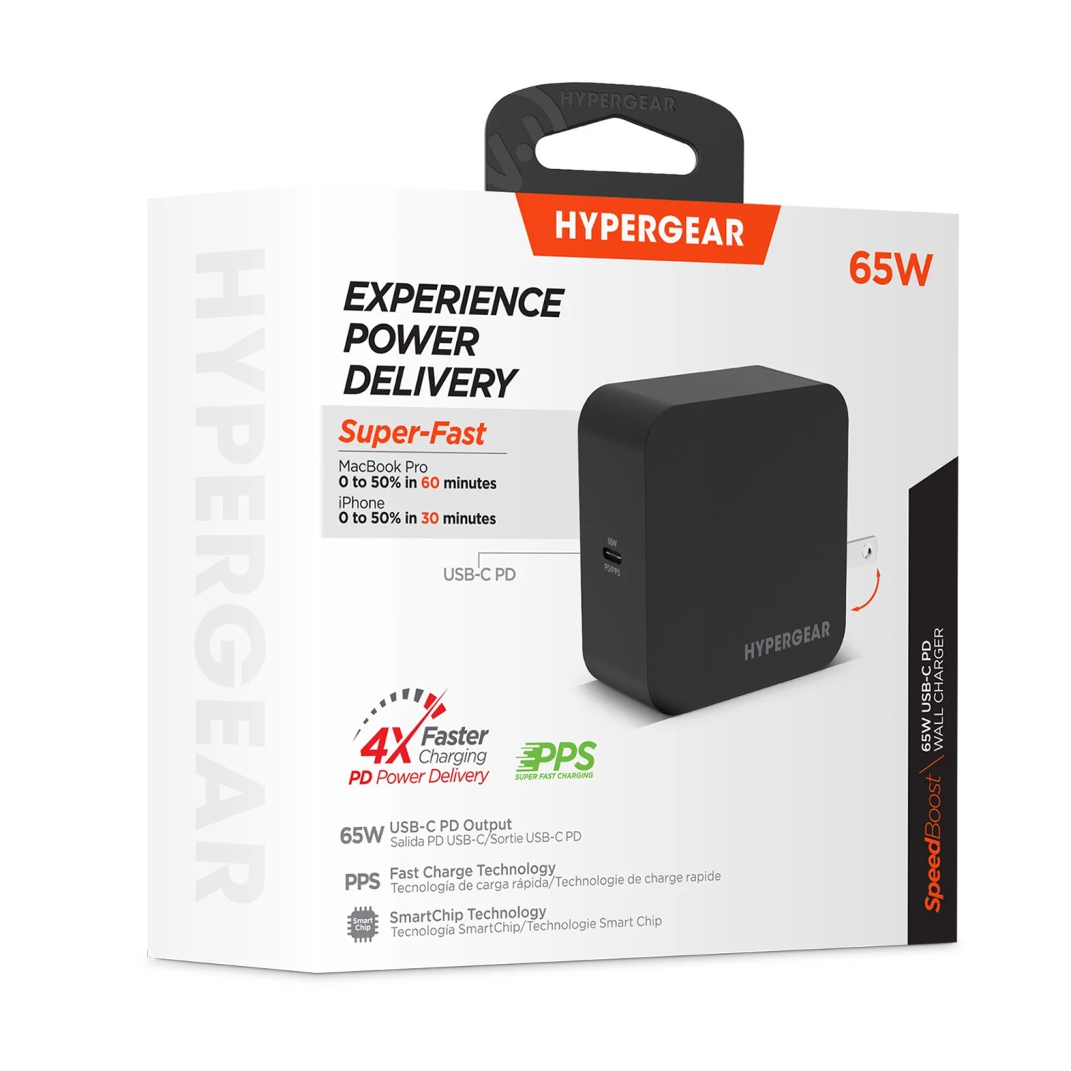 With Power Delivery (PD) and PPS efficient fast charging technology, the GyperGear SpeedBoost 65W USB-C PD/PPS Wall Charger is capable of full-speed laptop charging with the ability to intelligently scale down and deliver an optimized super-fast charge for the latest iPhones and Android smartphones – 0 to 50% in under 30 minutes! This charger is able to make micro-adjustments throughout the entire charging cycle to boost its efficiency, charge your phone even faster, and protect your phone battery from harmful heat buildup. Charge up your laptop, then plug in your phone, and by the time your laptop needs power again, your phone will be at 100.