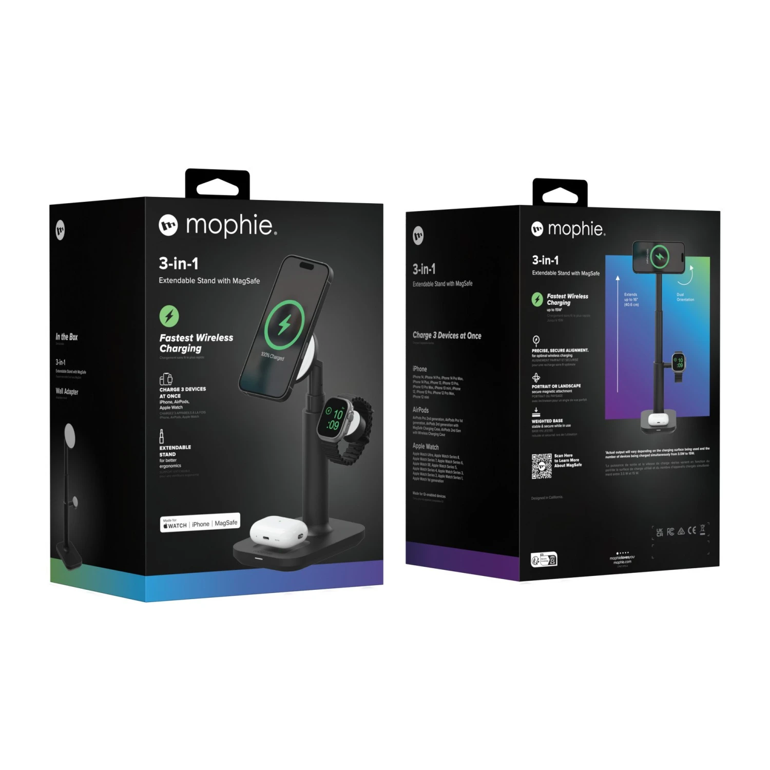 Charge your iPhone, Apple Watch and AirPods all in one spot with the mophie Wireless 3-in-1 Extendable Stand with MagSafe, delivering up to 15W of power. Charge all three simultaneously at their fastest speeds.