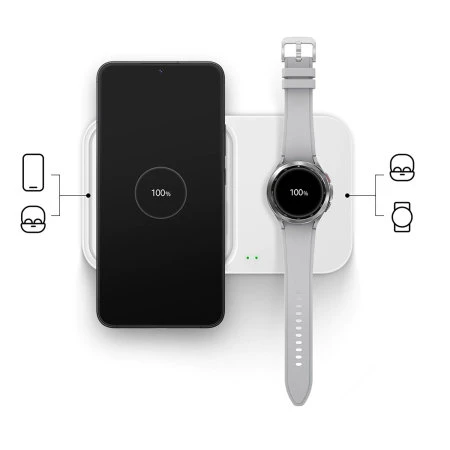 Say goodbye to cables cluttering your space, the Samsung Wireless Duo Charger lets you power up your device without having to connect any cables to your devices. Simply place your Qi-compatible devices onto the wireless charger to power up quickly, so you can spend the rest of your day on the go. With 15w charging capabilities, this wireless charger will give your devices the juice they need in no time at all! Perfect for the moments when time is of the essence!