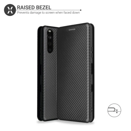 The Olixar Carbon Fibre Flip case features a carbon fibre effect design that compliments the beautiful design of your Sony Xperia 1 III. Whilst the original Sony Xperia 1 III construction makes the phone quite slippery and easy to drop, the Olixar Carbon Fibre Flip case offers a more secure grip, meaning you’re far less likely to drop your phone. This is a great first line of defence, often overlooked!