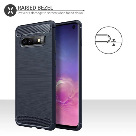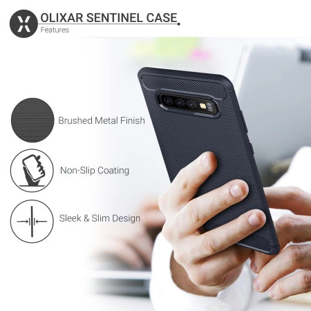 Protect your phone from scratches, knocks and drops with the Olixar Sentinel for the Samsung Galaxy S10. Featuring a rugged, flexible, textured TPU body and that is tough enough to protect your device, without adding unnecessary bulk. The flexible and robust TPU core features shock absorbing strength allied with a stunning carbon-fibre and brushed metal style finish on the back. The inner patterns also help deflect shock force and aid heat dissipation.