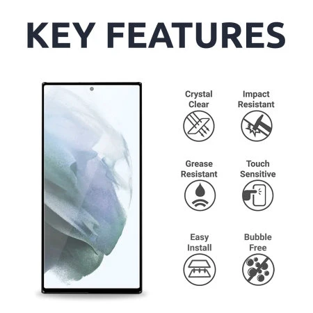 The Olixar Tempered Glass Screen Protector won’t diminish the sharpness or brightness of your Samsung Galaxy S22 Ultra ‘s display. This glass screen protector is ultra-clear and has a 95% light penetration ratio, compared to plastic screen protectors that generally have an 80% light penetration ratio.