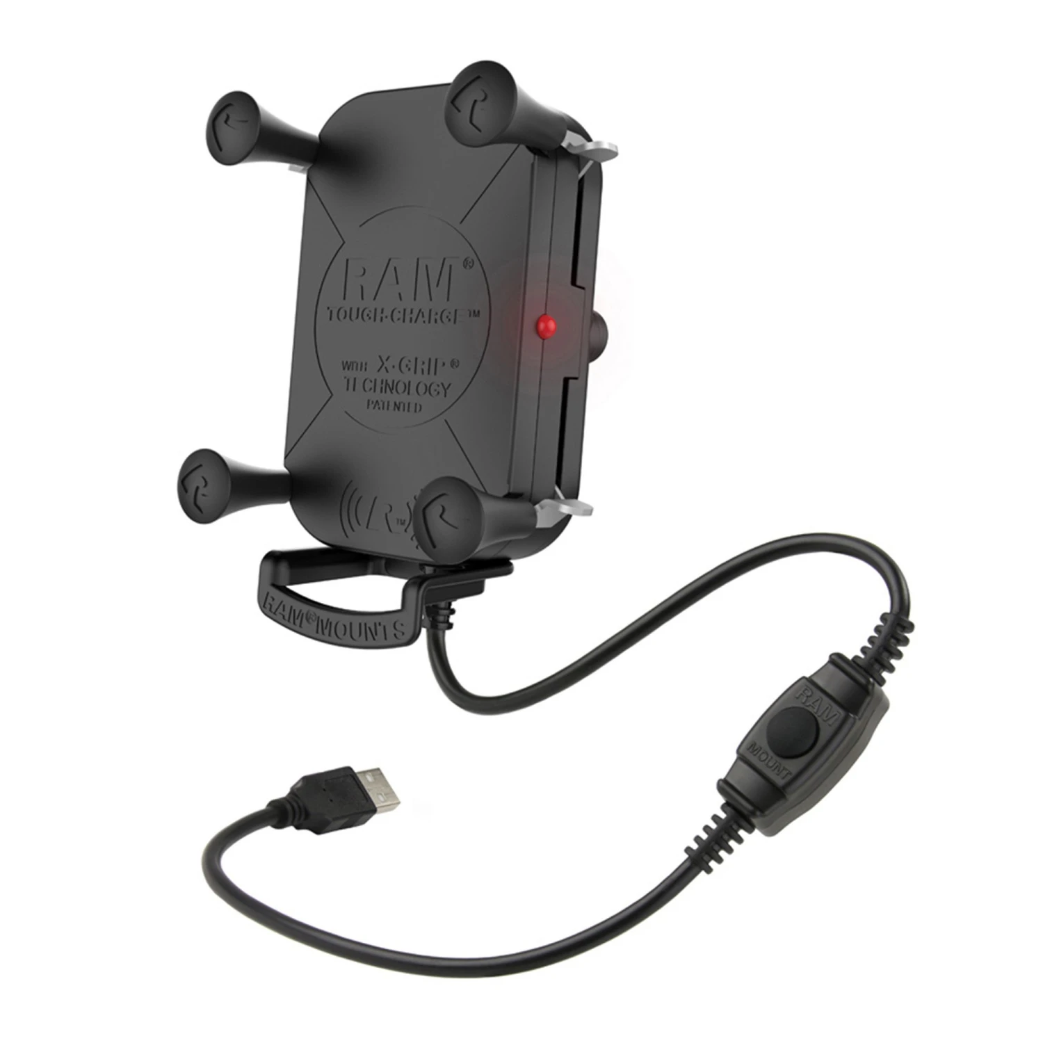 The RAM® Tough-Charge™ with X-Grip® Technology is the world’s first patented, universal waterproof wireless charging cradle for phones. Designed with spring-loaded RAM® X-Grip® Technology, this cradle features an ‘X’ design that expands and contracts to secure nearly any phone while taking advantage of Qi compatible wireless phone charging. All four arms feature rubber-coated caps that hold your phone firmly in place, and the open design keeps buttons and switches accessible on the sides of phones. To insert your device, simply squeeze the arms on one side of the cradle and place your phone inside before releasing the arms. This Qi compatible wireless charging cradle ensures your compatible phone charges no matter what position it’s placed at. For added security and peace of mind, a device tether is included that’s recommended for outdoor applications. In addition, a support leg can be adjusted to the ideal position or removed altogether. This RAM® Tough-Charge™ with X-Grip® Technology wireless charging kit for vehicles includes a B size diamond base featuring a 1” rubber ball – perfect for attaching to your choice of B size RAM® double socket arm. The connected Type-A male pigtail connector features an in-line switch that allows you to turn off the wireless charging module when not in use. For in-vehicle charging, attach the pigtail to the included 1.2m Type-A male to Type-A female extension cable.