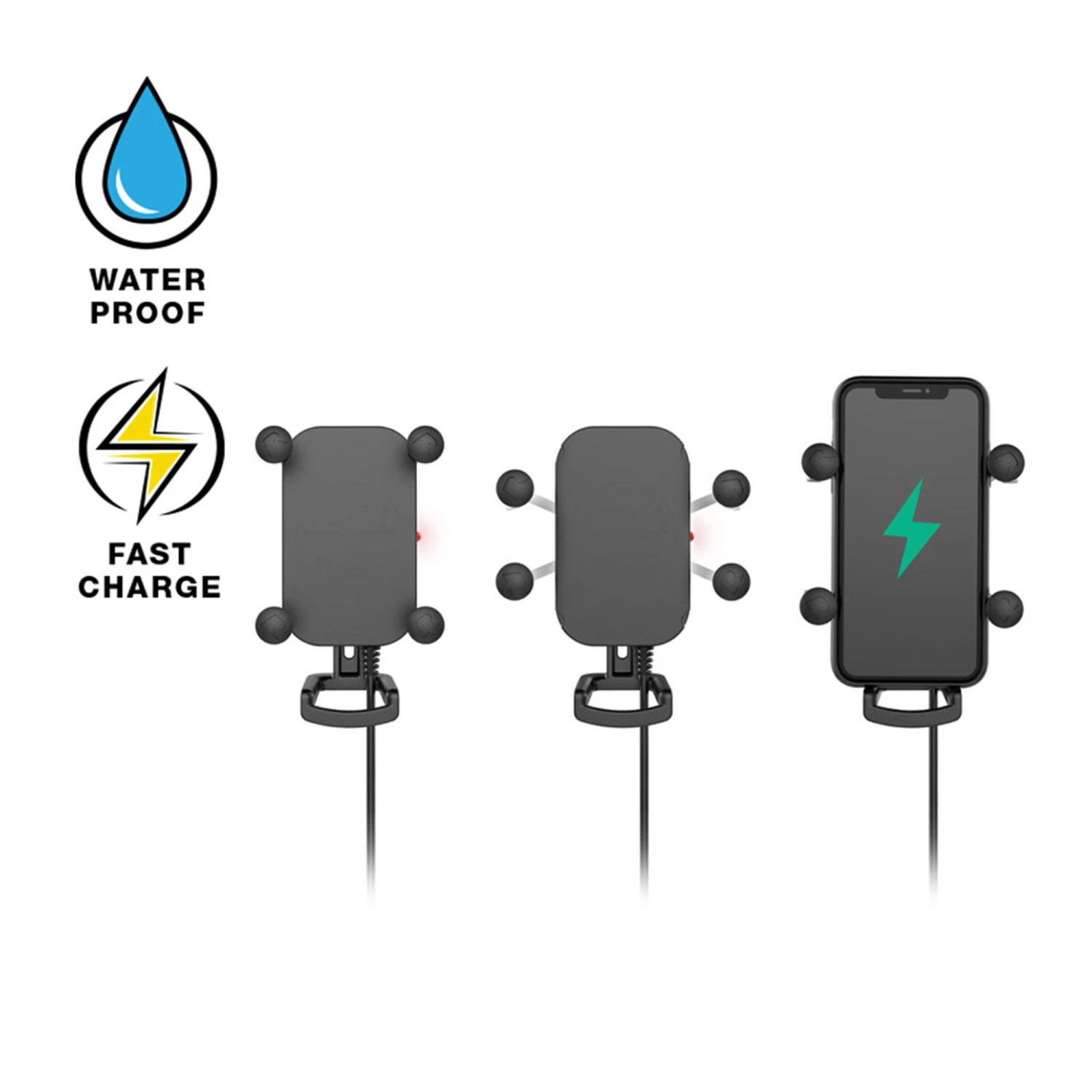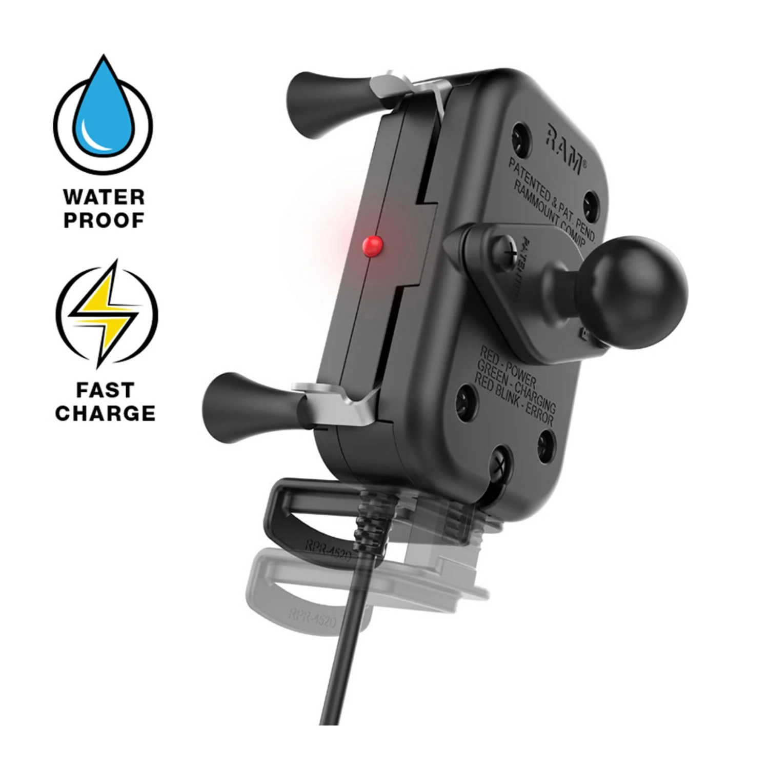 - Waterproof Qi compatible wireless phone charging cradle features spring-loaded RAM® X-Grip® technology and 10W maximum output