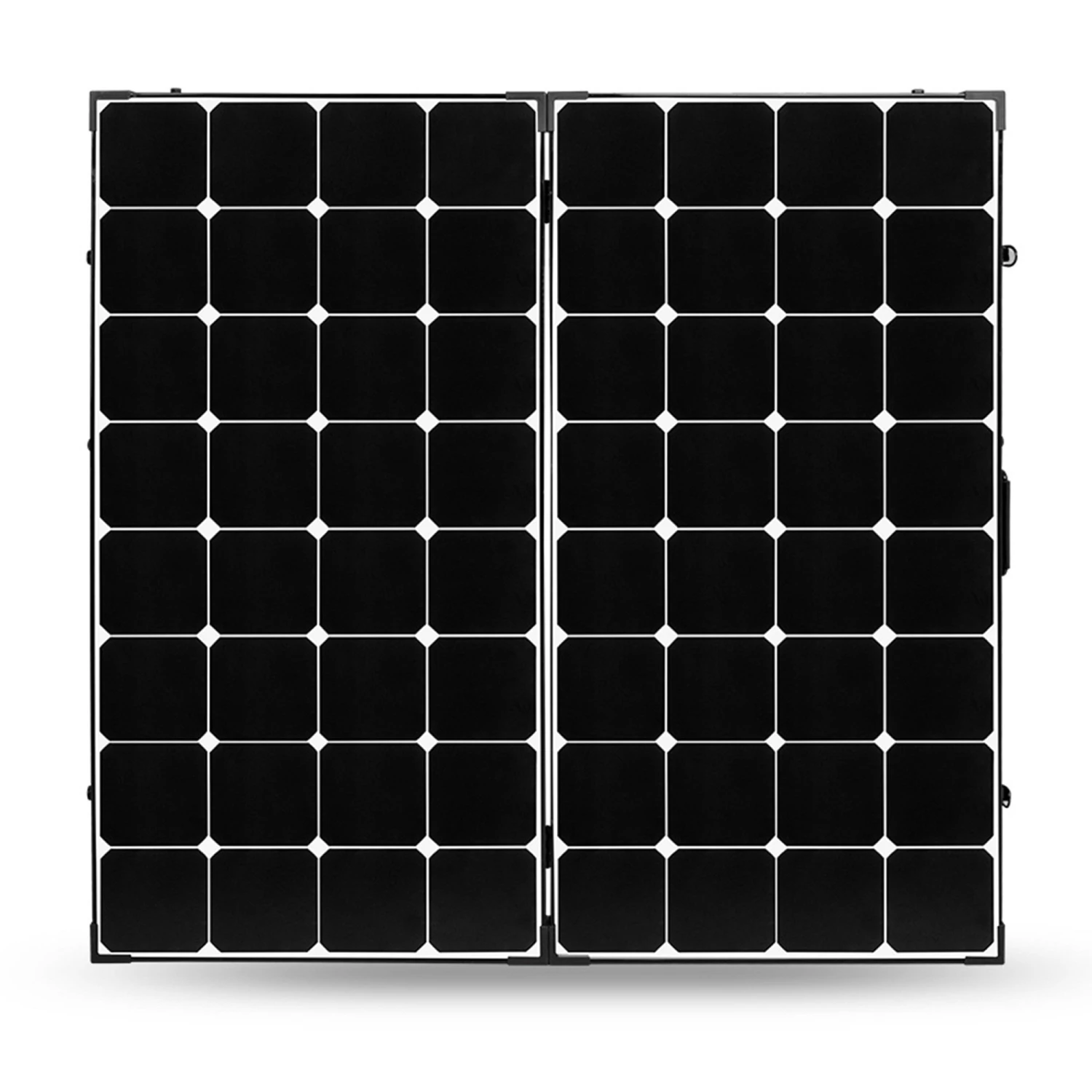Excellent performance in low-light environmentsTwo 100 watt Eclipse Solar Panels Adjustable, corrosion-resistant aluminum stand as well as a heavy-duty handle and latches for longevityProtective casingCompatible with gel, sealed, and flooded batteries